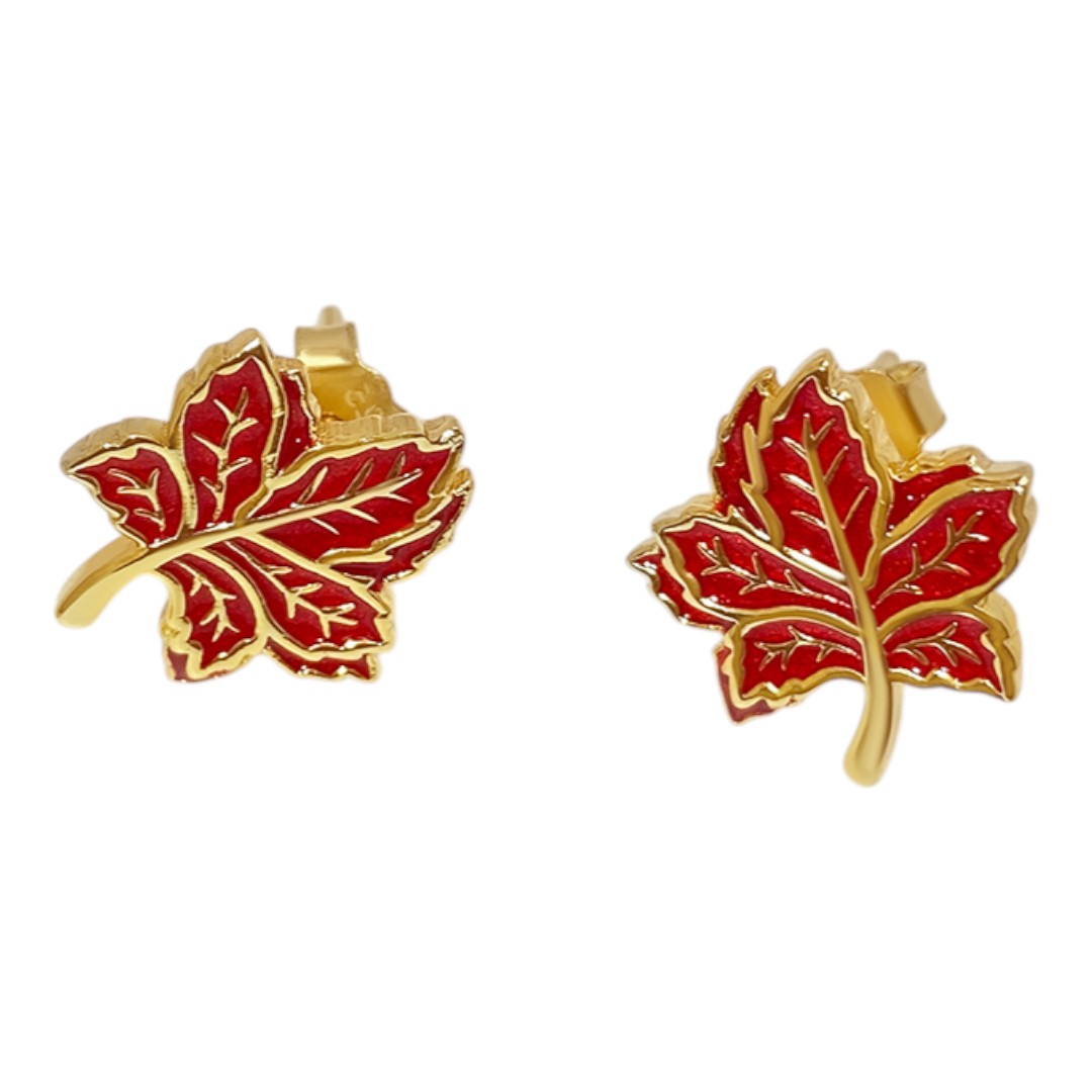 18K Gold Plated Red Maple Leaf Stud Earrings – Sterling Silver Enamel Jewelry for Women