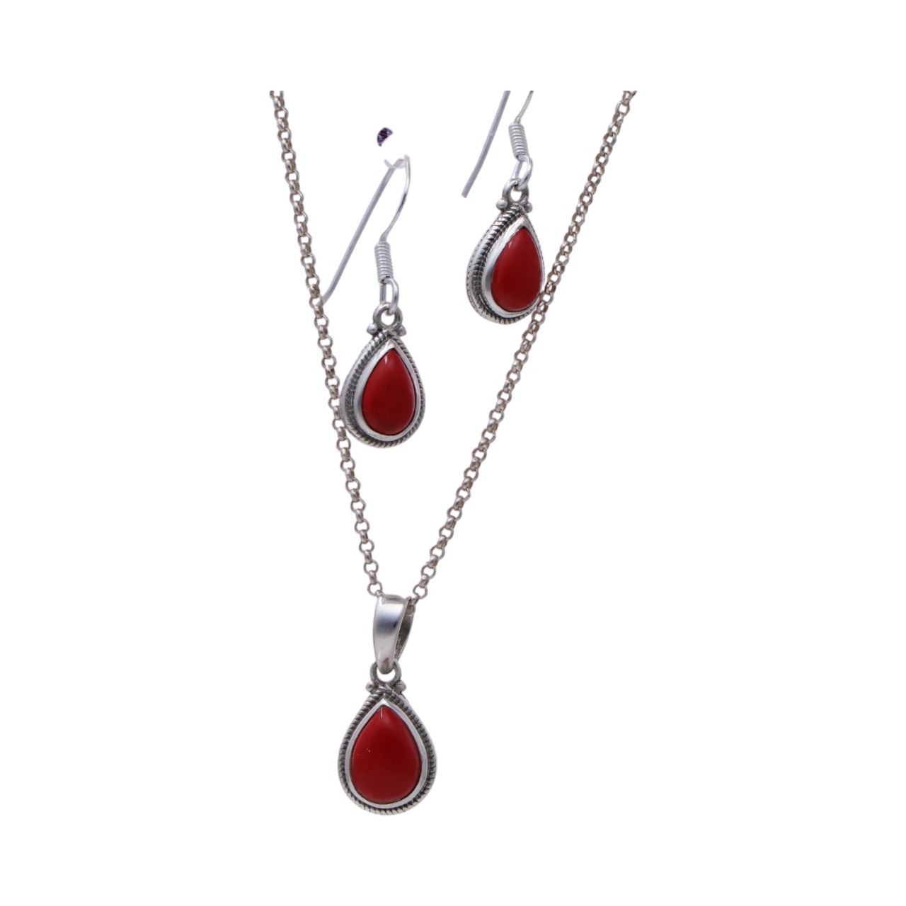 Stunning Tear drop Silver Red Coral Pendant & Earrings Set | Handcrafted Beauty and Elegance
