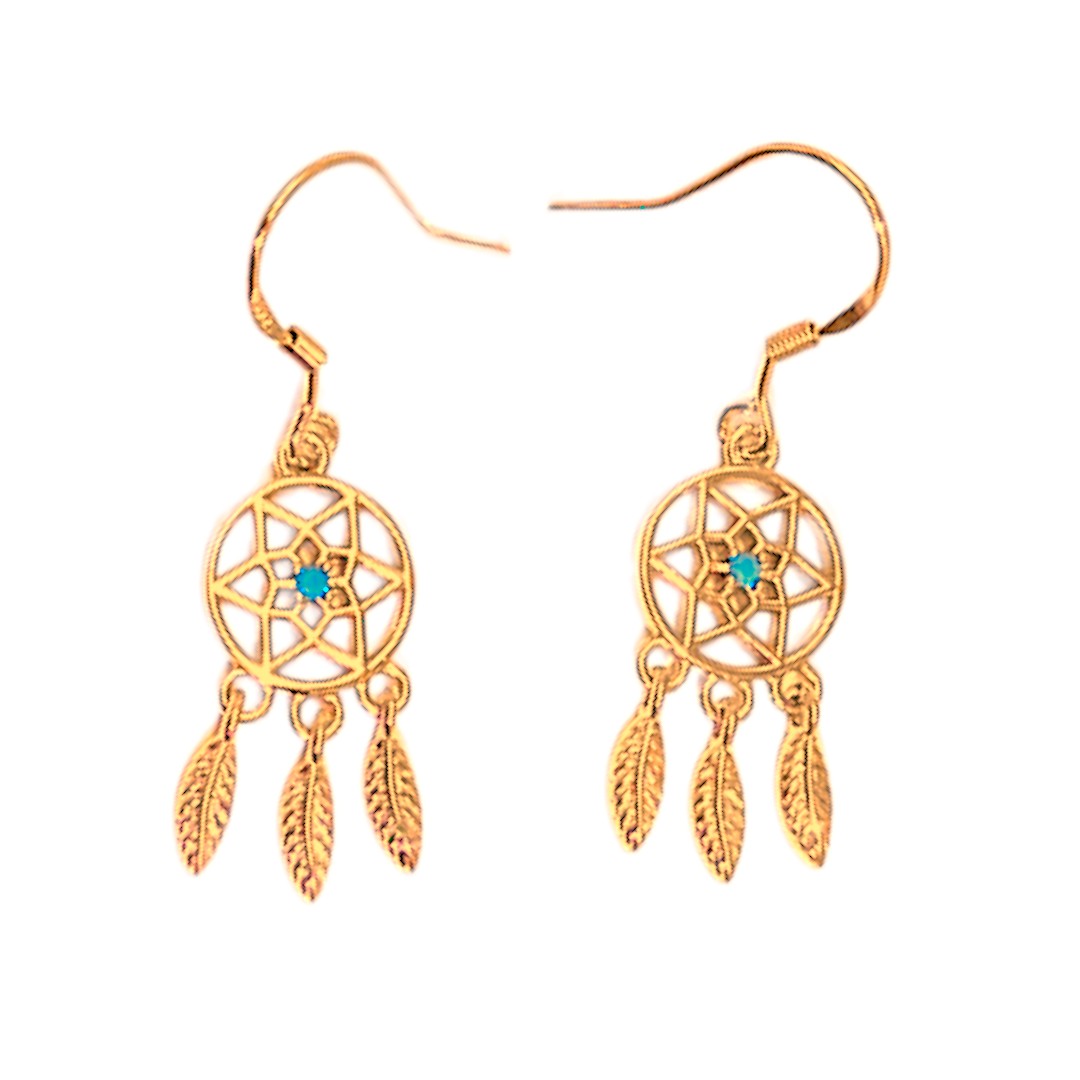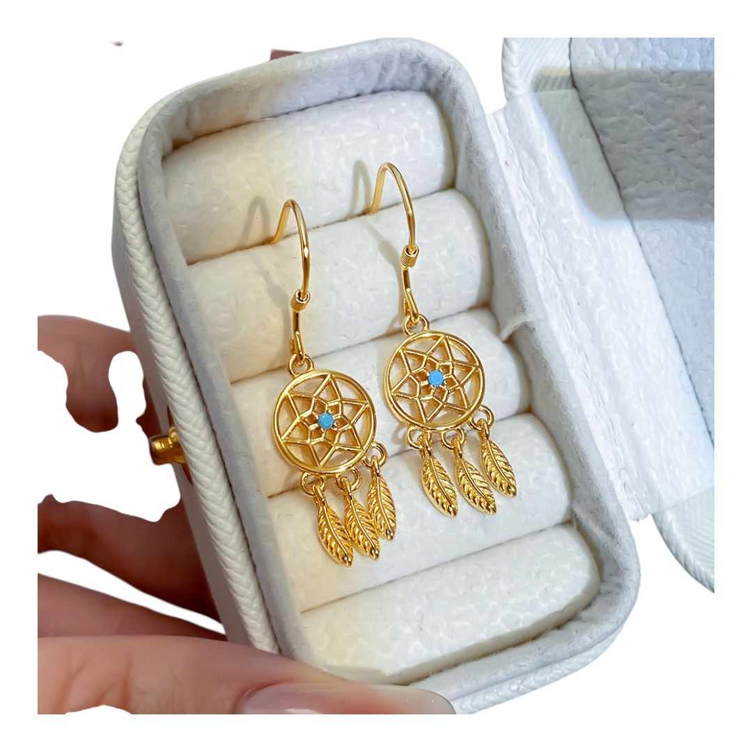 Embrace your bohemian spirit with our enchanting Blue Stone Dreamcatcher Earrings, meticulously crafted from 18K gold-plated sterling silver. These stunning dangle earrings are more than just an accessory; they are a statement of artistry and individuality.