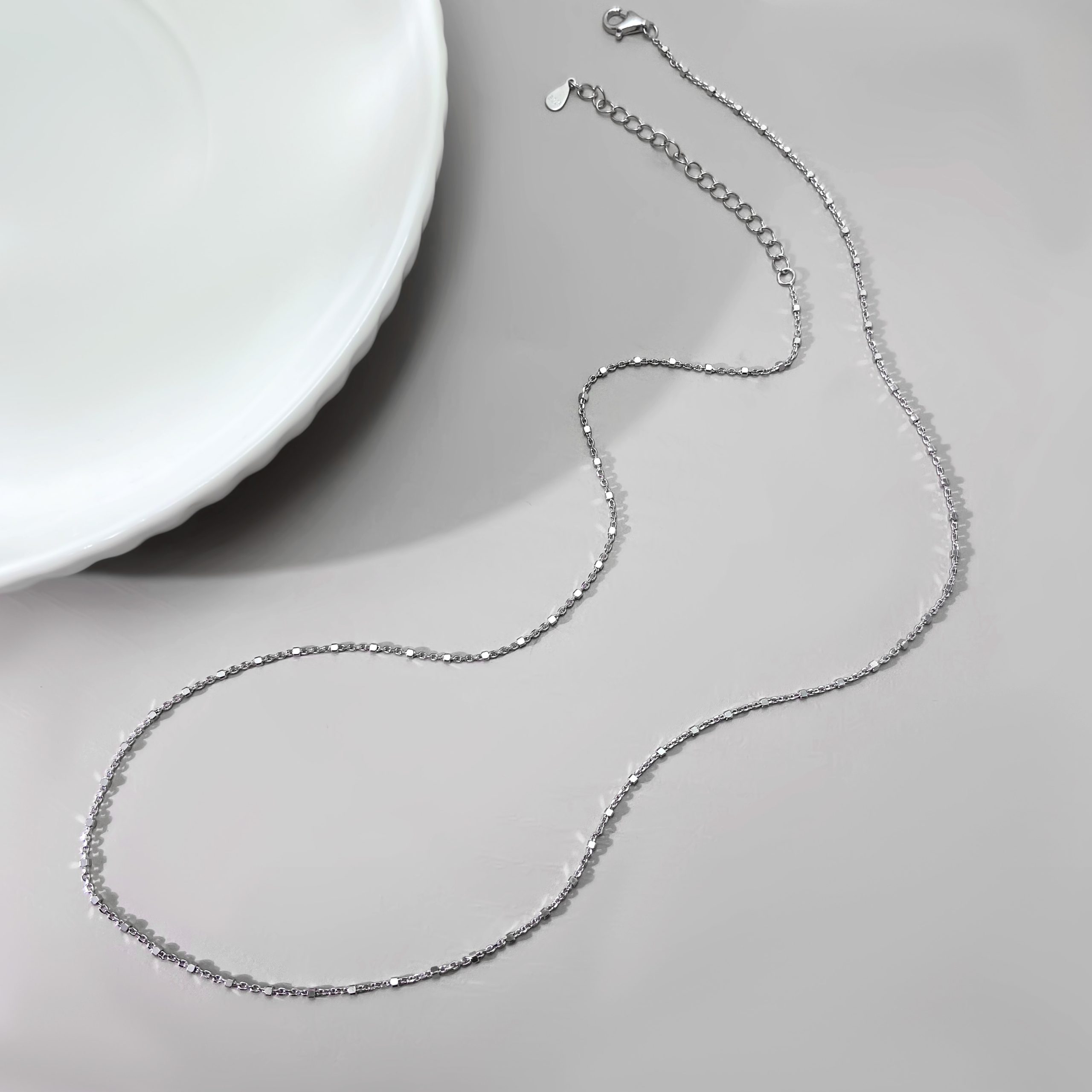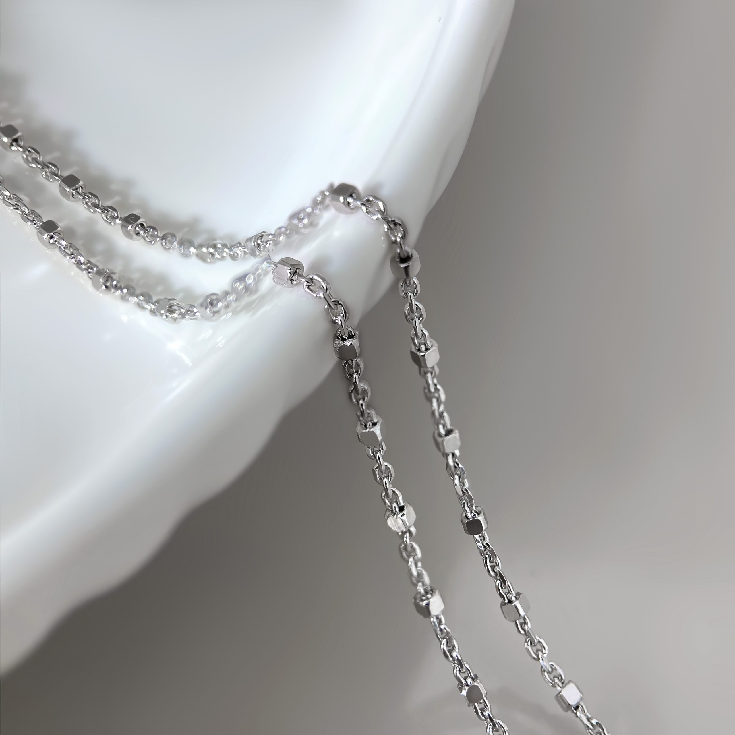 Introducing our exquisite faceted bead-like design Silver Elvra Chain, a stunning blend of contemporary artistry and timeless elegance. Each piece showcases a subtle sparkle that catches the light, creating a captivating play of reflections and hues.