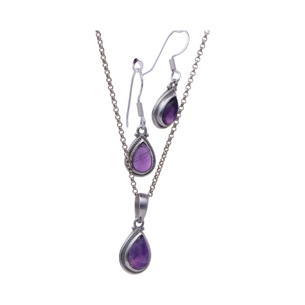 Introducing our stunning high-quality sterling silver set that includes a perfectly crafted amethyst pendant and matching earrings. This set is a must-have for any jewelry lover looking to elevate their collection. Made from genuine sterling silver, these pieces are not only beautiful but also durable, ensuring long-lasting use. The pendant features an eye-catching teardrop-shaped amethyst gemstone, while the earrings boast a delicate amethyst centerpiece. The deep purplish hue of the amethyst adds a touch of elegance and sophistication. The set comes in a beautiful and luxurious gift box, making it an ideal present for a loved one or even for yourself. Our sterling silver amethyst set is versatile, suitable for both formal and casual occasions, adding a touch of refinement to any outfit. Bold and graceful, this set will make you stand out from the crowd. Upgrade your style with our sterling silver amethyst set today.